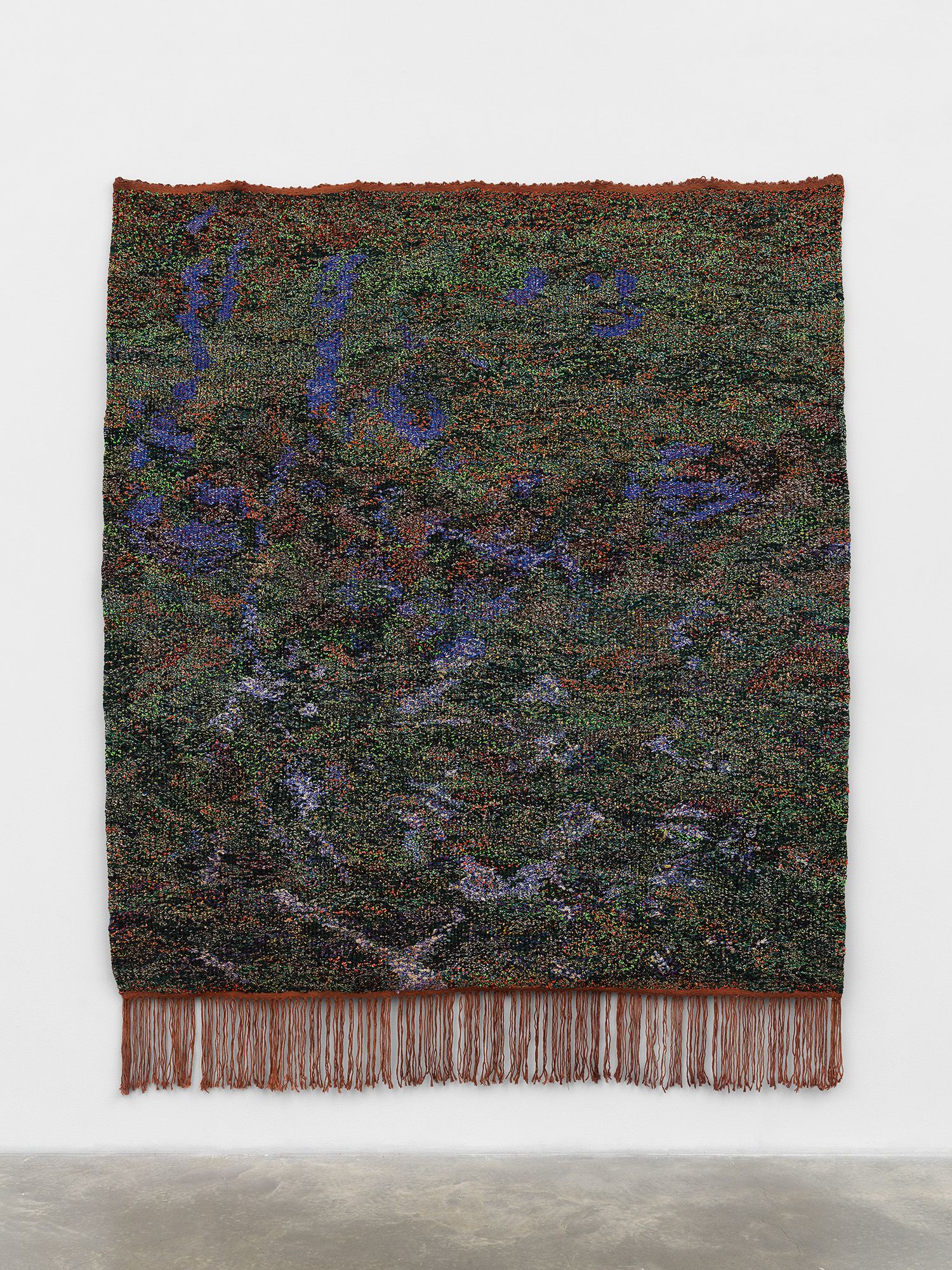 His dance imprint tapestry series, initiated in 2023, records the footsteps of members of the Garage Dance Ensemble. Using pigment imprints, colored beads, cotton rope, fabric, chains, and mohair, Adams constructs dense, layered compositions in which each footprint carries a distinct life story. Works such as Opheffing (2024), with violet fibers tracing luminous footprints against dark grounds, pulse with memory in motion, articulating visions of liberation and renewal.