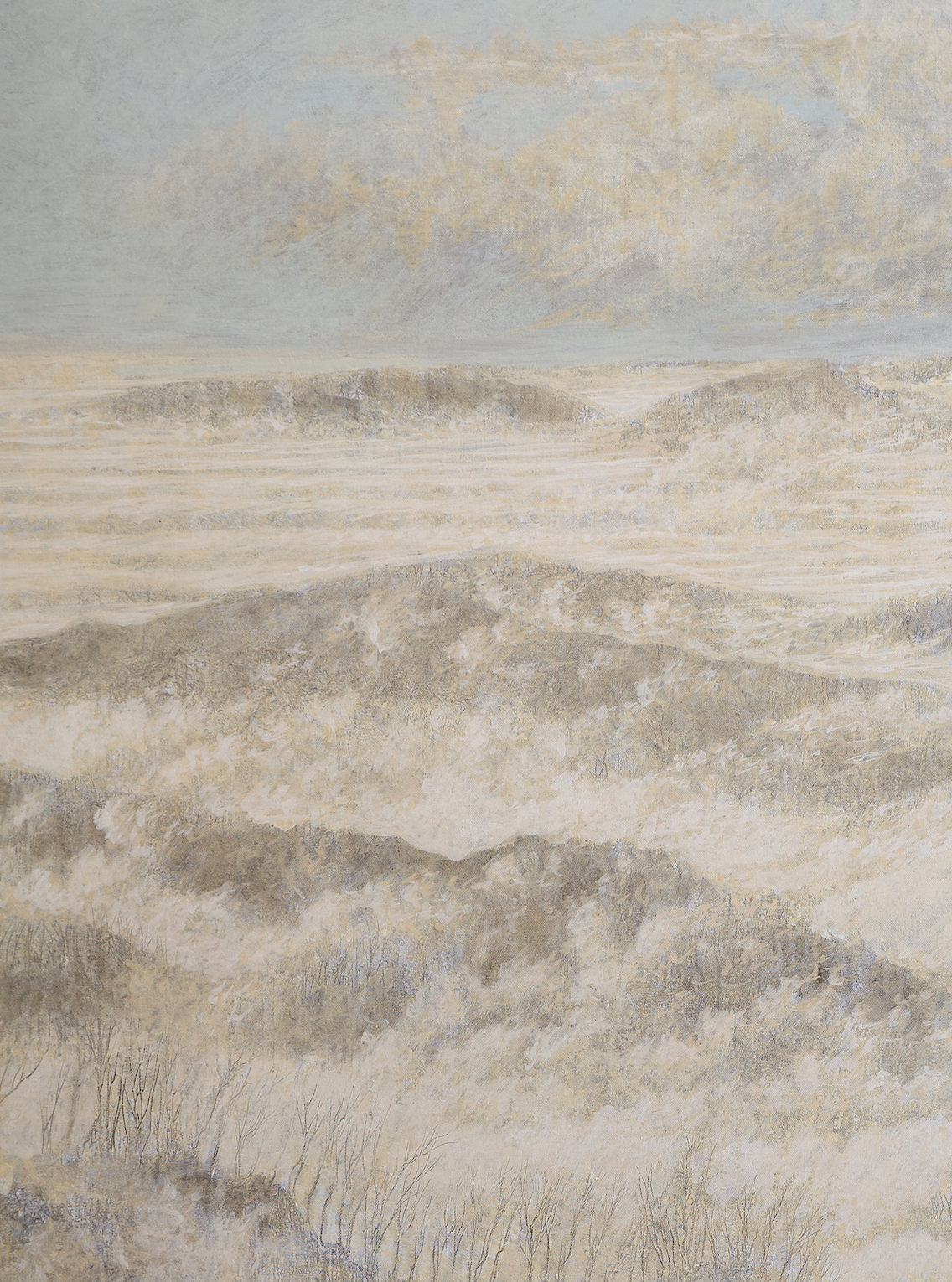 Cima’s landscapes evoke, for me, the yellowed texture of aged Chinese xuan paper or the earthy tones of ancient grotto murals. This sense of familiarity arises from his meticulous attention to detail and his intuitive ability to connect distant times and terrains. His approach resonates strongly with ideas found in Chinese landscape painting, such as the notion expressed in Linquan Gaozhi (Lofty Ambitions in Forests and Streams): “Painting is the dance of the brush and the trace of the heart.” Landscape, in this view, is not a depiction of mountains and water, but an expression of the artist’s spirit, emotion, and cultivation.