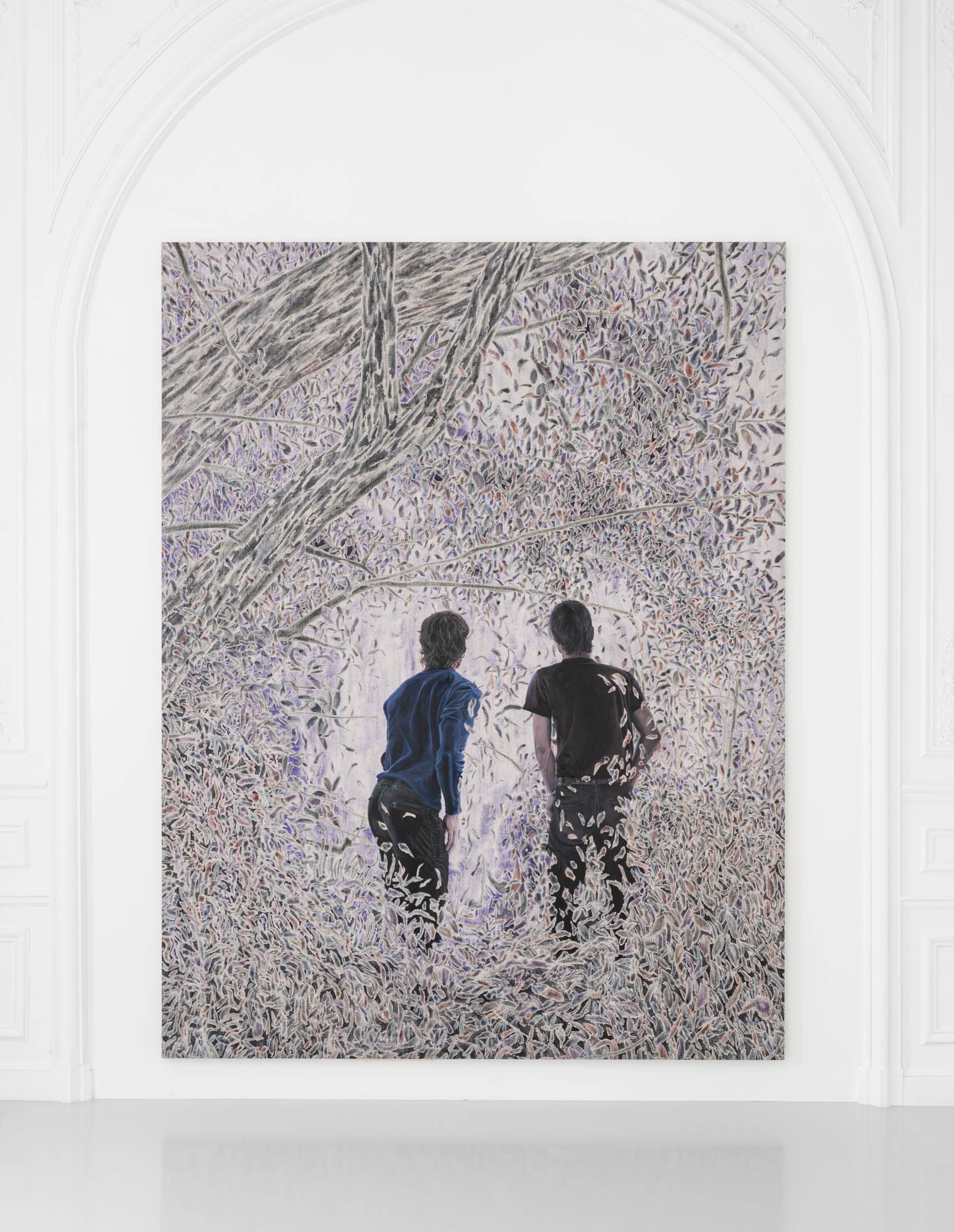 Jake Grewal’s practice is deeply informed by the European tradition of landscape painting, skillfully drawing upon Romantic structures and visual language. His paintings range from lush forests to charred, mist-laden terrains. Nude bodies—predominantly male—often appear within these settings, forming contemplative spaces that hold queer intimacy and desire.