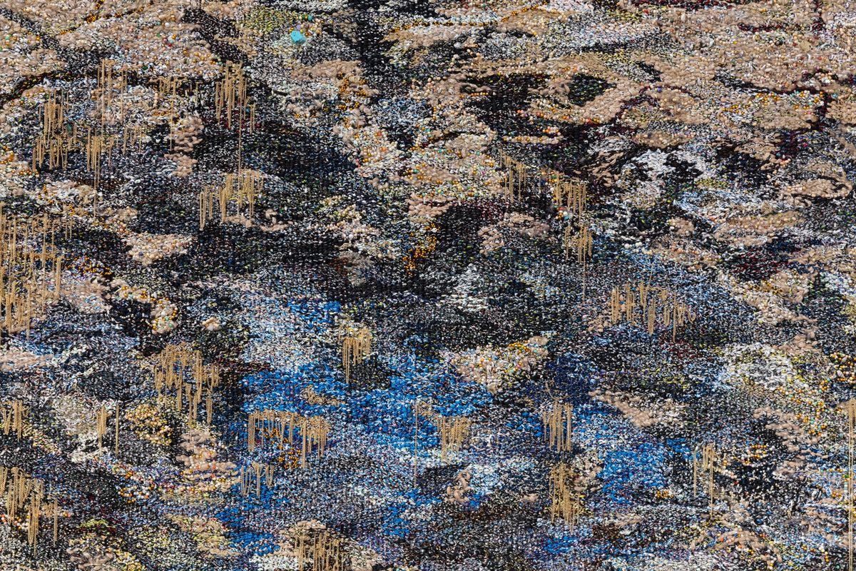 The rapid international recognition Adams has received from both institutions and collectors can be attributed to his distinctive approach to material. Raised in Cape Town, South Africa, amid complex intersections of culture, religion, and class, Adams developed a practice rooted in materials drawn from everyday life: thread, beads, wire, linoleum, cotton rope, and fabric. These materials carry not only personal memory but also collective symbolism. His works, often composed as fiber-based and suspended installations, evoke both textiles and cartographic forms. Embedded within their warp and weft are sustained inquiries into identity, belief, and belonging. This practice is deeply poetic, yet clearly situated within the broader discourse of international contemporary art.